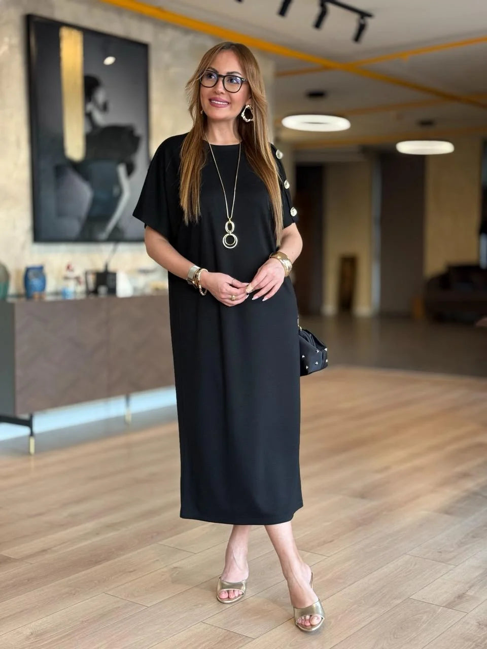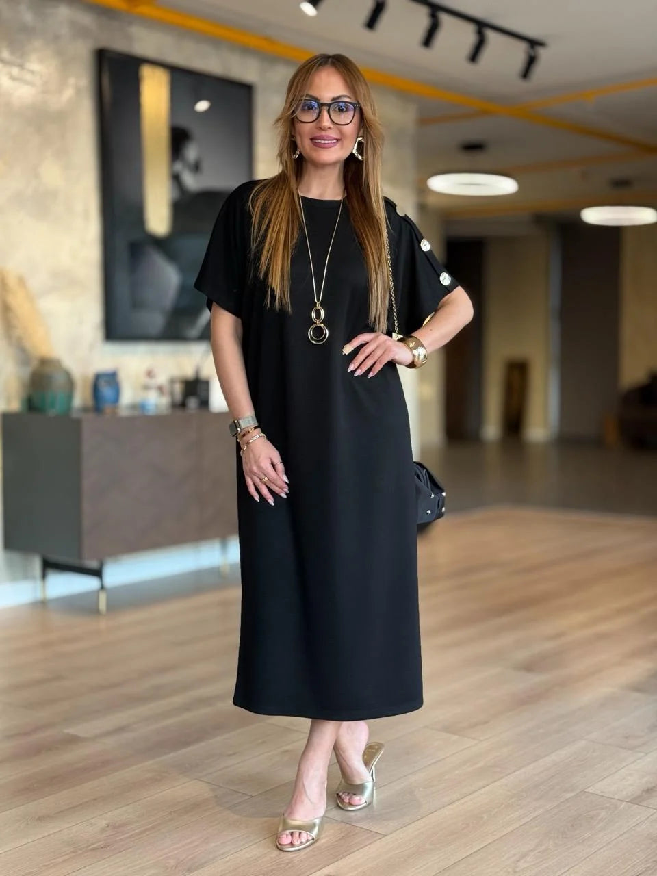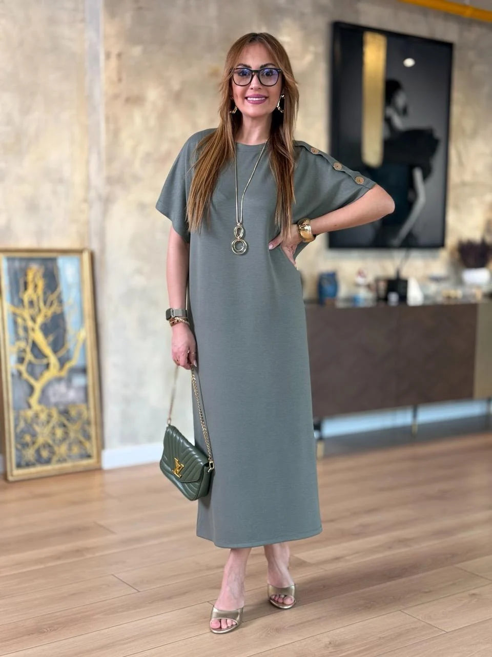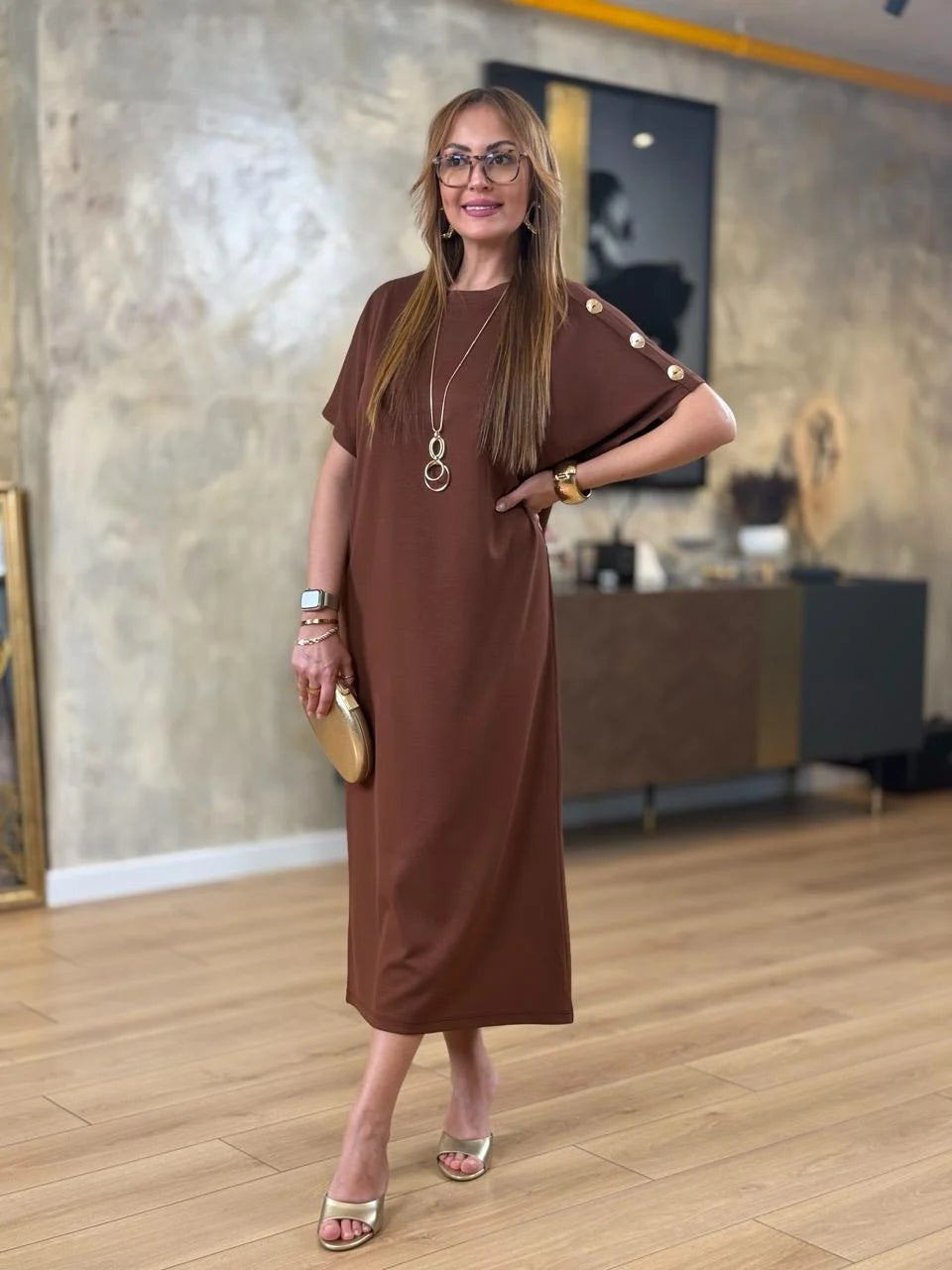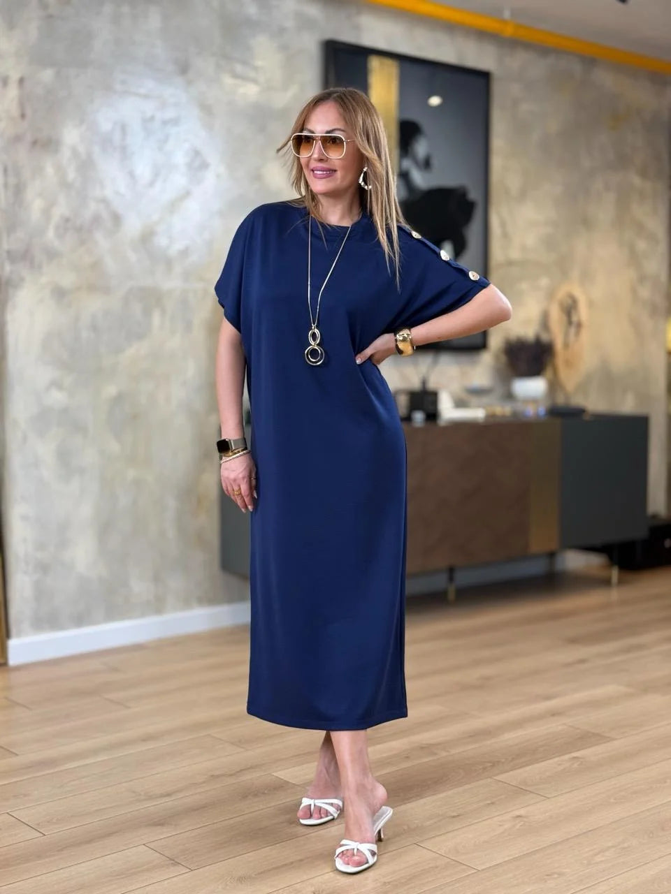 Kadın ZARA KREP kumaştan üretilmiş, omuzlarında gold düğme detayları ve yarasa kol tasarımıyla öne çıkan bu elbise, hem günlük kombinlerinizde hem de özel davetlerde zarif bir duruş sergilemenizi sağlar. Hafif ve yumuşak dokusuyla gün boyu rahatlık sunarken, gold düğme detaylarıyla stilinizi tamamlar.