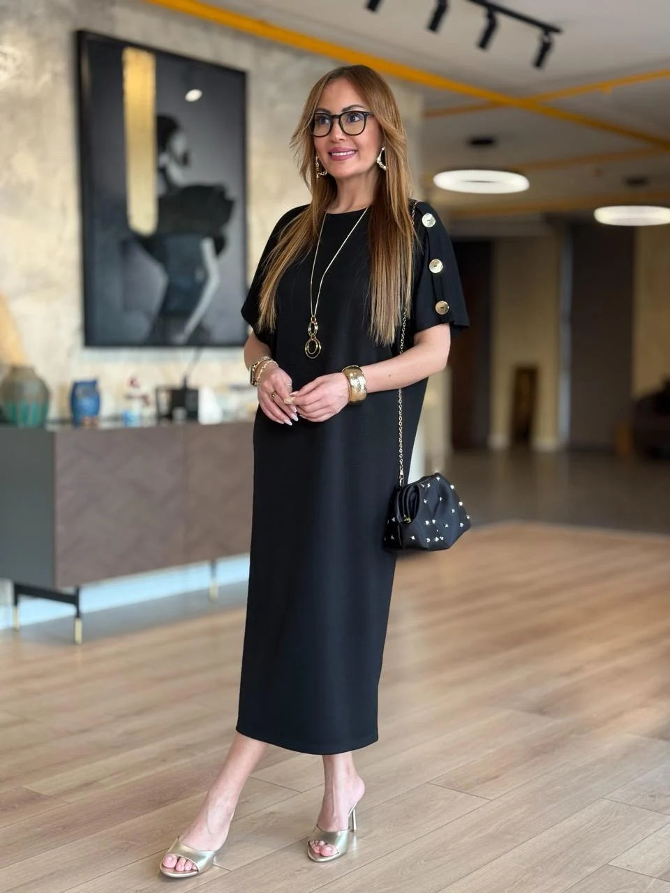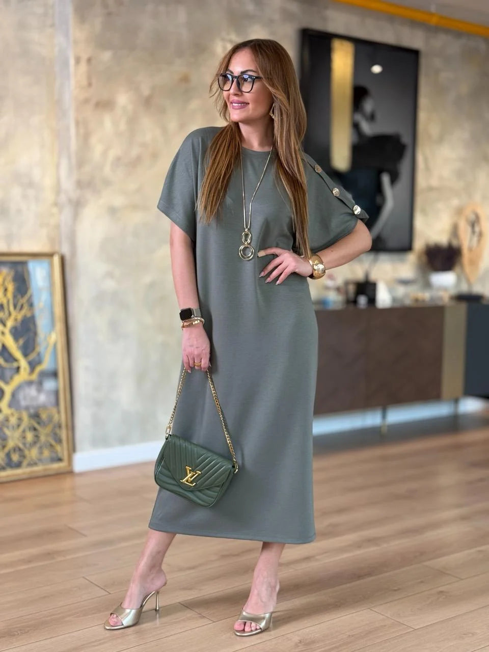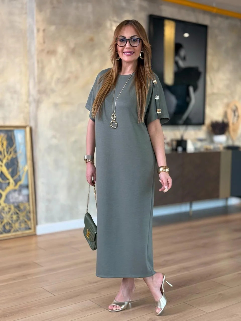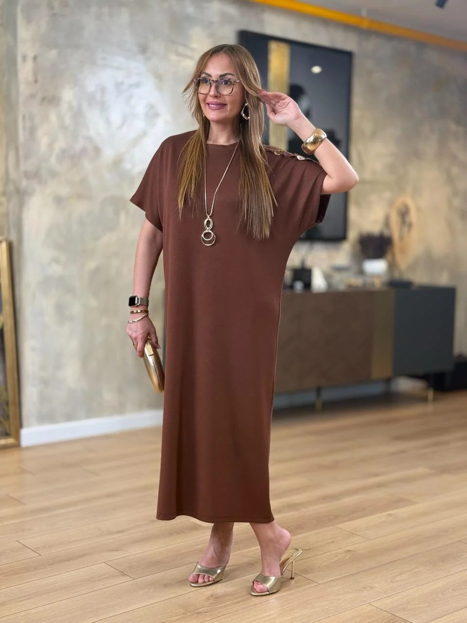 Kadın ZARA KREP kumaştan üretilmiş, omuzlarında gold düğme detayları ve yarasa kol tasarımıyla öne çıkan bu elbise, hem günlük kombinlerinizde hem de özel davetlerde zarif bir duruş sergilemenizi sağlar. Hafif ve yumuşak dokusuyla gün boyu rahatlık sunarken, gold düğme detaylarıyla stilinizi tamamlar.