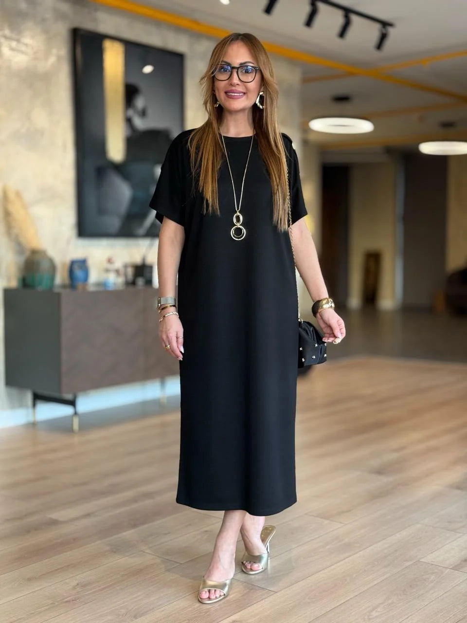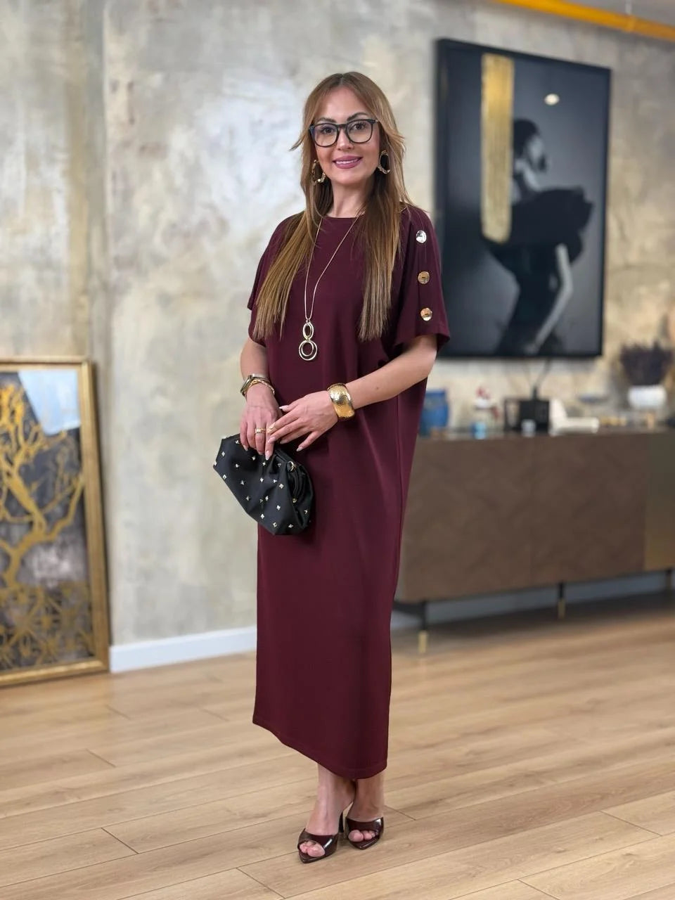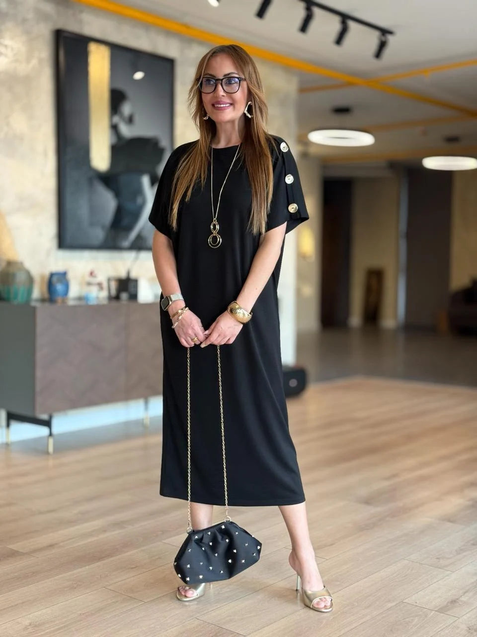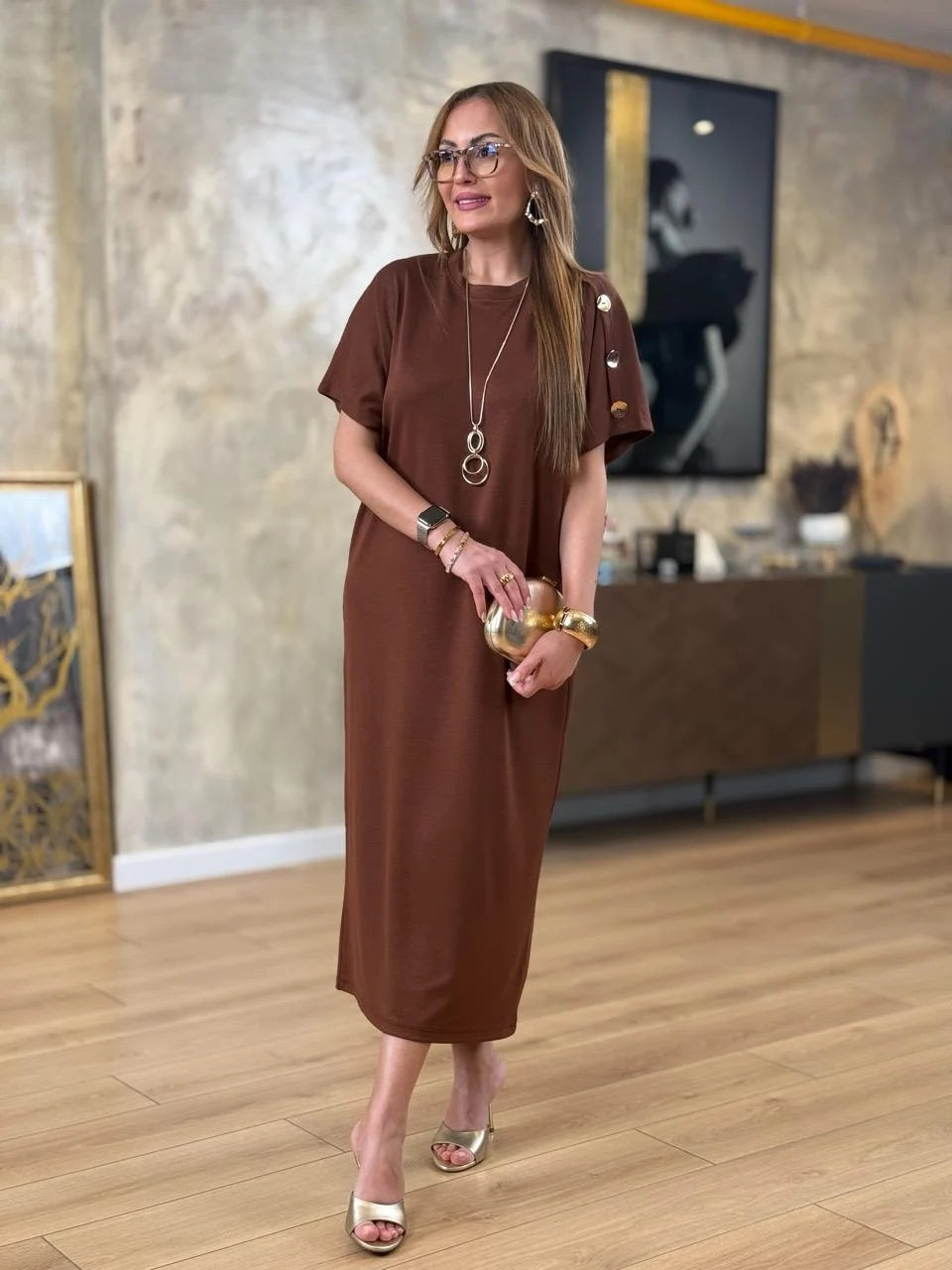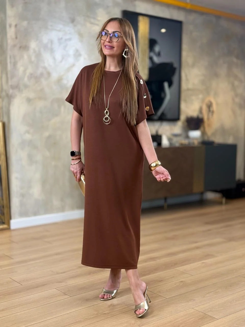 Kadın ZARA KREP kumaştan üretilmiş, omuzlarında gold düğme detayları ve yarasa kol tasarımıyla öne çıkan bu elbise, hem günlük kombinlerinizde hem de özel davetlerde zarif bir duruş sergilemenizi sağlar. Hafif ve yumuşak dokusuyla gün boyu rahatlık sunarken, gold düğme detaylarıyla stilinizi tamamlar.