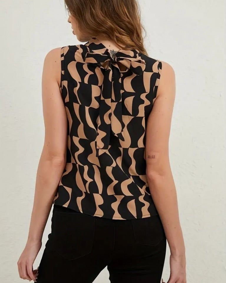 Kadın kolsuz balıkçı yaka boyundan bağlamalı dalga desen bluz