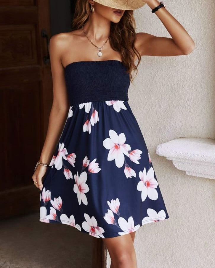 Kadın straplez gipe detay çiçek baskılı süprem elbise